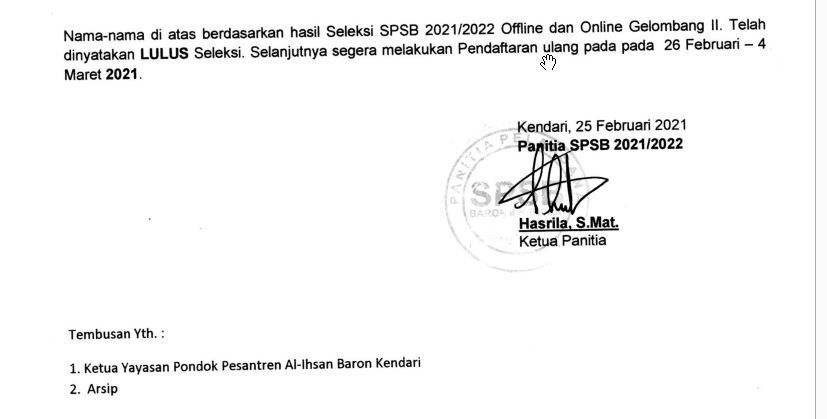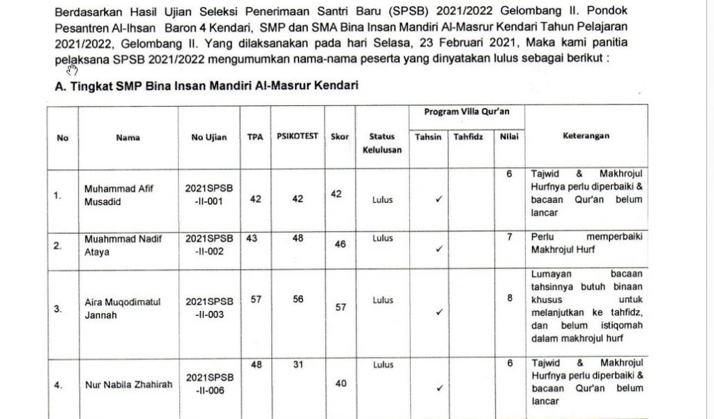 Assalamu’alaikum warahmatullahi wabarakatuh… Alhamdulillah setelah pelaksanaan tes gelombang 2, sampailah pada pengumuman calon santri yang diterima di pondok pesantren Al-Ihsan Baron Kendari & SMP & SMA Bina Insan Mandiri Al-Masrur Kendari. Selamat datang untuk seluruh calon santri yang lulus Seleksi Penerimaan Santri Baru Gelombang kedua.
