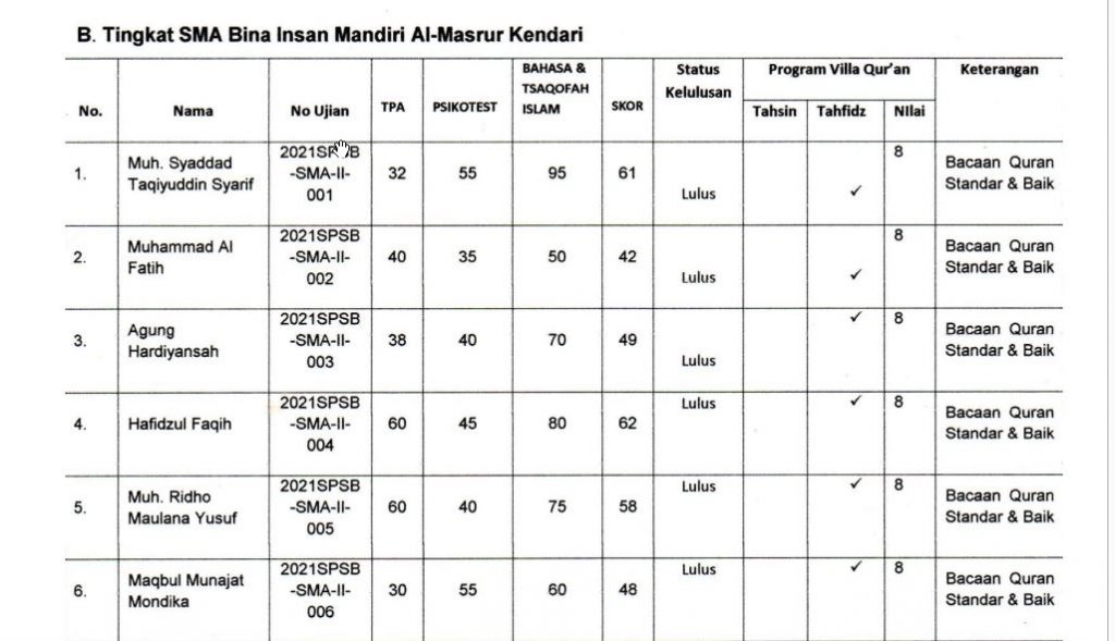 One thought on “Pengumuman Seleksi Penerimaan Santri Baru (SPSB) SMP & SMA BIMa Al-Masrur Kendari 2021/2022 Gelombang Kedua”