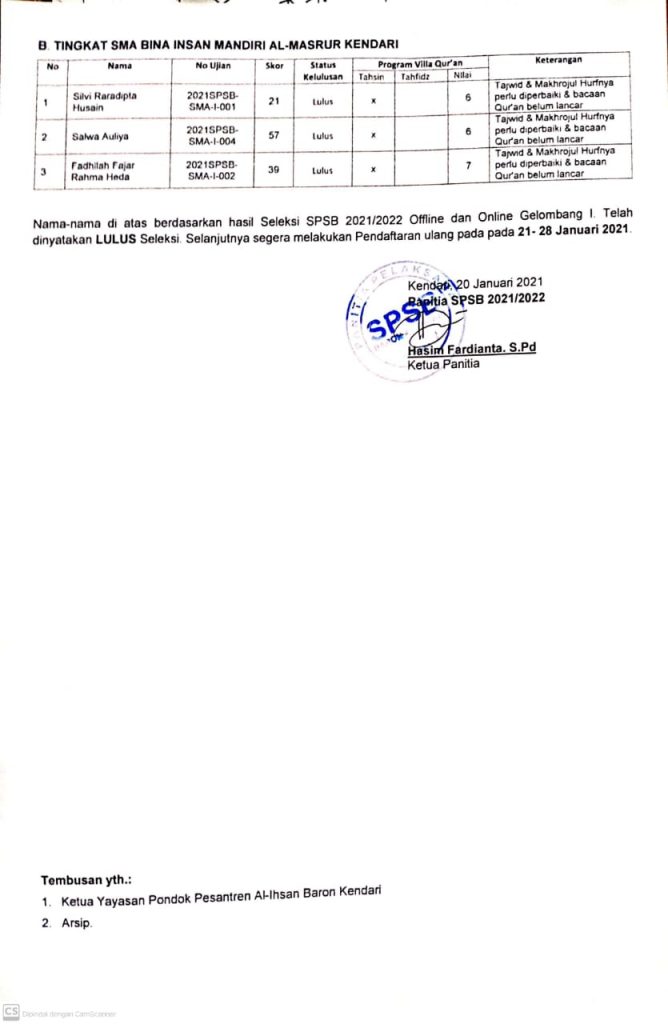 Alhamdulillah setelah pelaksanaan tes gelombang pertama, sampailah pada pengumuman calon santri yang diterima di pondok pesantren Al-Ihsan Baron 4 Kendari & SMP & SMA Bina Insan Mandiri Al-Masrur Kendari. Selamat datang untuk seluruh calon santri yang lulus Seleksi Penerimaan Santri Baru Gelombang pertama.